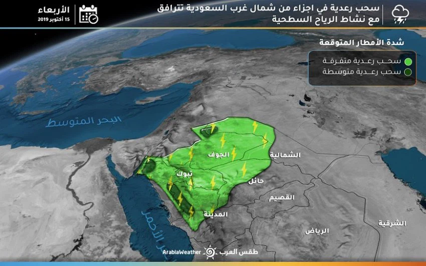 تستمر الفرصة مهيأة لسقوط زخات رعدية من الأمطار على شمال المملكة قد تمتد لأجزاء من منتصفها، تغزر أحياناً خاصة على المرتفعات جنوب شرق منطقة تبوك.