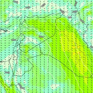 - والرياح شمالية غربية نشطة السرعة، يصحبها هبات قوية أحياناً تصل سرعتها لل70كم/ساعة وتتسبب بإثارة الأتربة والموجات الغُبارية الكثيفة في مناطق واسعة من العراق بما فيها العاصمة بغداد وبخاصة في المناطق الوسطى والجنوبية من العراق مما يتسبب بتدني مدى الرؤية الأفقية ورُبما انعدامها، وتسود حالة غُبارية واسعة النطاق أجواء البلاد.