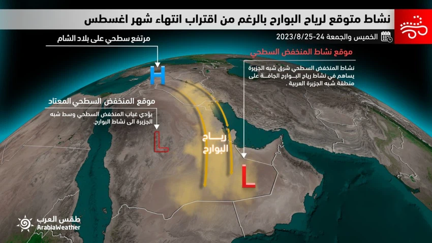 وتأتي نشاط هذه الرياح في ظل تمركز مرتفع سطحي على منطقة بلاد الشام، بالتزامن مع تمركز منخفض سطحي إلى الشرق من شبه الجزيرة العربية، ما يدفع بالرياح الشمالية الغربية النشطة من جنوب العراق باتجاه الكويت والأجزاء الشرقية من شبه الجزيرة العربية.