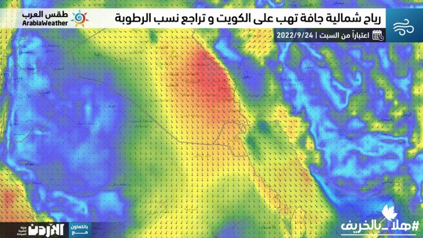 وبحسب ذات الخرائط الجوية عبر نظام بدر المُطور من قبل طقس العرب، يُتوقع أن تنشط الرياح الشمالية الغربية من جديد على الكويت اعتباراً من يوم السبت القادم، مُترافقة بِهبات قوية أحياناً تتجاوز حاجز 60 كم/الساعة، لتتراجع نسب الرطوبة في الأجواء، ويكون الطقس حاراً و جافاً و مُغبراً في أغلب المناطق بإذن الله، مع احتمالية تدني مدى الرؤية الأفقية بشكلٍ واضح في العديد من المناطق خاصةً الصحراوية و المكشوفة.
