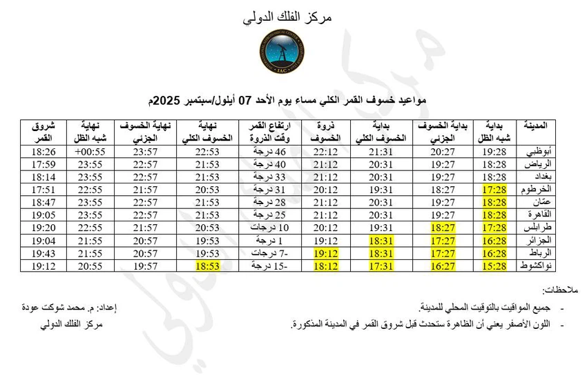 الجدول التالي يُظهر مواعيد وتفاصيل خسوف القمر في عدد من الدول العربية ليل الأحد 7-9-2025م بحسب مركز الفلك الدولي: