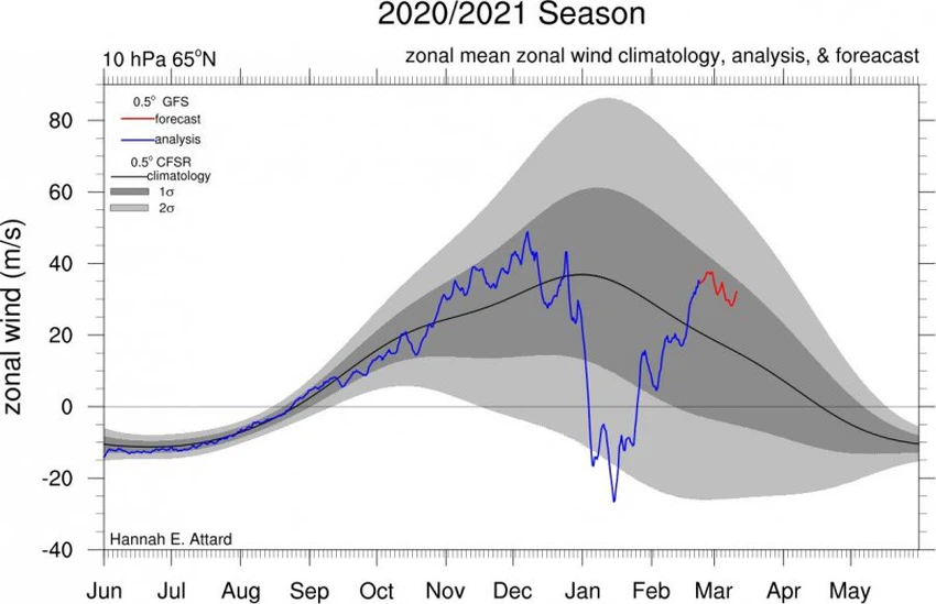 كان الطقس المُتطرف هو السمة البارزة في شهر فبراير ناتجًا عن الاحترار الستراتوسفيري المفاجئ (Sudden stratospheric warming) الذي أصاب القطب الشمالي على ارتفاع حوالي 30كم في شهر يناير الماضي، أدى الاحترار في الستراتوسفير إلى إضعاف الدوامة القطبية (Polar Vortex)، مما عمل على تباطئ في التيارات الغربية في الدوامة القطبية، وبالتالي تيار نفاث قطبي أكثر تعرجًا واندفاعًا نحو العروض الدنيا، وانفلات أكثر للكتل القطبية واندفاعها بعيدًا عن محور نظام القبة القطبية، لا بد ان احترار الستراتوسفير المفاجئ اصبح نمطًا وسلوكًا للقبة القطبية بعدما حدث بشكلٍ متكرر في المواسم الماضية، والمسؤول عن هذا الاحترار موجات روسبي من خلال ارتفاع درجات الحرارة ثم إنخفاضها وهي التي تساهم في تشكل بؤر زيادة ونقص الأوزون، فقلة الأوزون الذي يتركز في (في أدنى الستراتوسفير وأعلى التروبوسفير) يشكل سببًا رئيسيًا في احترار طبقة الستراتوسفير، إن تبعات الاحترار تظهر جليتًا في خريطة الشذوذ لدرجات الحرارة لشهر نوفمبر، وتُظهر التباين الكبير في درجات الحرارة بين شرق وغرب القارة الأوروبية.