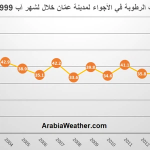 وتخلل الشهر الماضي، بعض الليالي الرطبة، ترافقت مع تشكل الندى وظهور السحب المنخفضة في بعض المناطق لاسيما المرتفعات الشمالية، وقد بلغ معدل الرطوبة النسبية في الأجواء لشهر آب / أغسطس شرق العاصمة عمّان بحدود 41.3%، فيما تجاوزت حاجز الـ 50% في العديد من المرتفعات الجبلية في شمال ووسط المملكة.