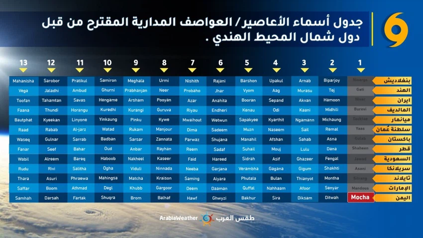 طقس العرب - تجري تسمية الحالات المدارية التي تتشكل في شمال المحيط الهندي بما فيه خليج البنغال من قبل المركز الإقليمي المتخصص للأرصاد الجوية ومقره في نيودلهي – الهند بالنيابة عن البلدان الأعضاء في المنظمة الدولية للأرصاد الجوية لآسيا والباسفيك، وقد تم تسجيل 65 اسم عربي في القائمة مُقترحة من مجموعة الدول العربية في اللجنة وهي: سلطنة عُمان، السعودية، قطر، الإمارات، واليمن.