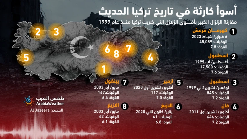 طقس العرب - ضرب زلزالان كبيران المنطقة الجنوبية الشرقية من تركيا بالقرب من الحدود مع سوريا يوم الإثنين (6 شباط/ فبراير 2023)، ما أسفر عن دمار واسع في المباني ووفاة الآلاف، في أسوأ كارثة في تاريخ تركيا الحديث، وسنعرض في هذا المقال تفاصيل الزلزال الكبير ونقارنه بأقوى الزلازل التي ضربت تركيا منذ العام 1999.