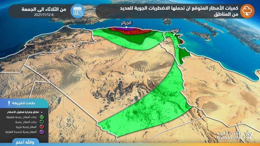 طقس العرب - تتأثر الجزائر وأجزاء من تونس بمشيئة الله بحالة ماطرة تتسم بالقوة خلال الأيام القليلة القادمة وهذه تفاصيلها.