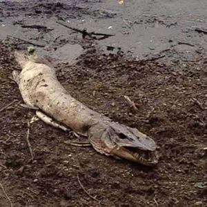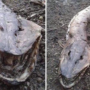 المتنزهون عثروا على الجثة على ضفة الحوض، واكتشفوا أن الفم المفتوح لهذا الكائن يتضمن سلسلة من الأسنان الحادة وطوله نحو 1.5 متراً.