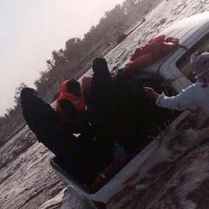 وتم نقل العائلة لمنطقة آمنة بعد أن علقت مركبتهم في الوادي وكادت السيول أن تجرفهم. وتمكن أحد أفراد الدفاع المدني من الدخول بالسيل وإنقاذ العائلة المكونة من مسن وأربع نساء.
