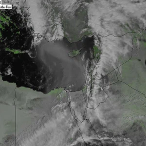 موقع ArabiaWeather.com-تُظهر صور الأقمار الاصطناعية المُلتقطة نهار الأحد 2-3-2014، تأثر أجزاء واسعة من الحوض الشرقي للبحر الأبيض المتوسط بموجة قويّة من الغُبار، نظراً لعُبور مُنخفض جوي خماسيني مُبكر من ناحية التوقيت.