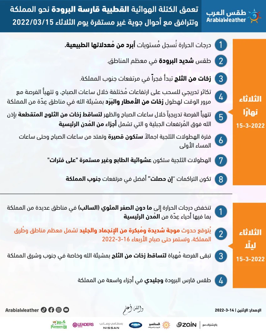 بث مُباشر | الطريفي عبر نبض البلد : زخات ثلجية متقطعة نهار الثلاثاء وموجة شديدة ومُبكرة من الأنجماد والجليد مساء الثلاثاء 15-3-2022