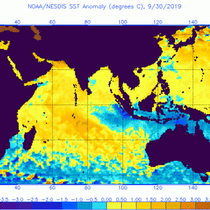 وتمثل الخريطة التالية، انحراف حرارة المياه السطحية في بحر العرب والمحيط الهندي وجزء من المحيط الهادي، ويمثل اللون الاصفر والبرتقالي الى تواجد مياه أكثر دفئاً من المعتاد بينما يمثل اللون الازرق الى تواجد مياه أكثر برودة من المعتاد.