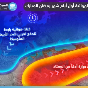 طقس العرب - تُشير أحدث القراءات الجوية لنماذج المُحاكاة الحاسوبية لحركة الكُتل الهوائية في القارة الأوروبية وبلاد الشام، بأنهُ عقب عودة درجات الحرارة إلى سياق مُعدلاتها المُعتادة يوم الأربعاء يُتوقع أن تتأثر عموم دُول الحوض الشرقي للبحر الأبيض المُتوسط بما في ذلك بلاد الشام بكُتلة هوائية أدفأ من المُعتاد ومُندفعة من الصحراء الإفريقية وذلك خلال الأيام الأولى من شهر نيسان 2022 والذي يُصادف حينها بداية شهر رمضان المُبارك إن شاء الله.