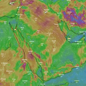 طقس العرب - سنان خلف - تهُب بمشيئة الله يوم الخميس على عموم منطقة الحدود الشمالية و الأجزاء الشرقية من المملكة بما فيها حفر الباطن الدمام والجبيل والخبر رياح شمالية غربية نشطة السرعة، مع هبات قوية أحياناً، تعمل إثارة الأتربة والغبار في الأجزاء الداخلية منها.