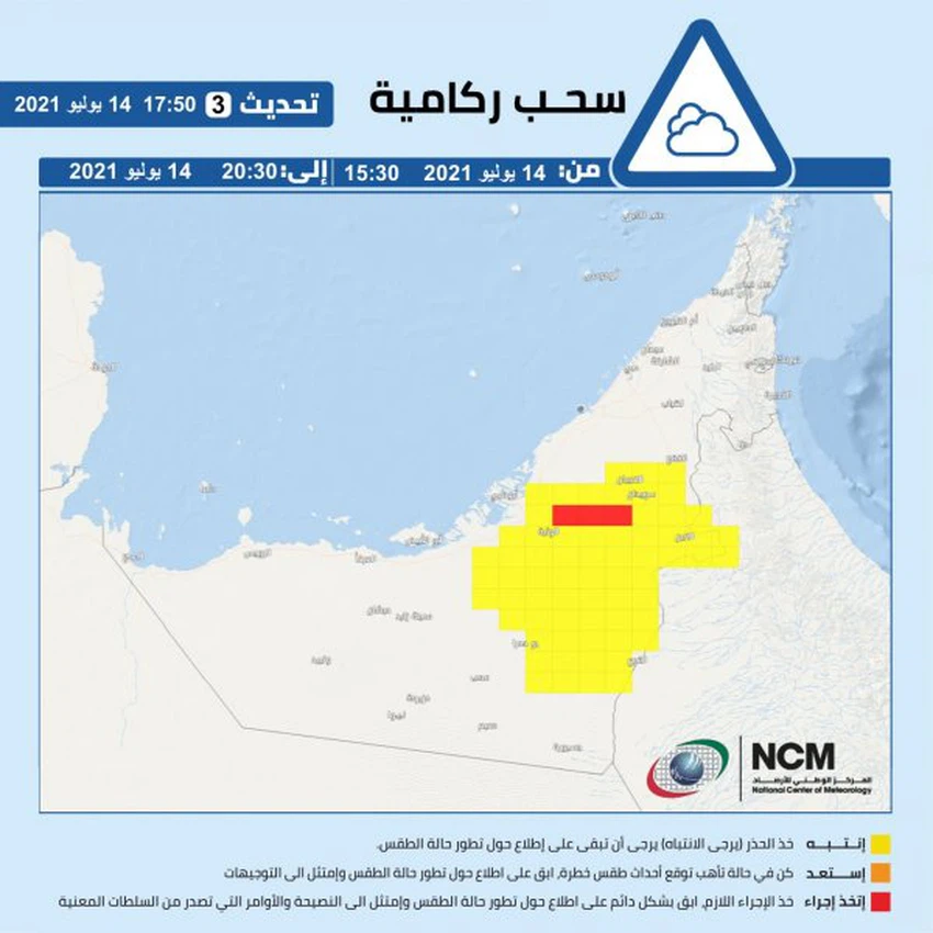 طقس العرب - رفع المركز الوطني للأرصاد مستوى التحذير لبعض مناطق غرب العين وشرق العاصمة ابوظبي إلى اللون الأحمر، وحذرت من سحب ركامية يصاحبها سقوط أمطار ورياح نشطة السرعة تصل سرعتها إلى 40 كم/س مثيرة للغبار والأتربة تؤدي إلى تدني مدى الرؤية الأفقية أحياناً من الساعة 16:10 وحتى الساعة 20:30 الأربعاء 14/07/2021.