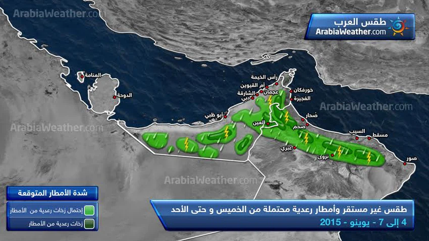 ويُتوقع أن تشهد الجبال الشرقية للبلاد،ومدينة العين وبعض المناطق الداخلية الصحراوية،تشكُلاً للسُحُب الرعديّة الماطرة خلال ساعات ما بعد الظُهر،والتي تترافق مع هبوب رياح نشطة مثيرة للغبار والأتربة.