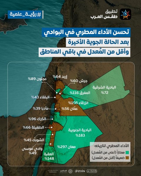 وسجّلت مناطق البادية الشرقية والجنوبية خلال الحالة الأخيرة تحسّنًا لافتًا في الأداء المطري، وفق بيانات إدارة الأرصاد الجوية وذلك عقب الهطولات التي رافقت الحالة الجوية الأخيرة، حيث أسهمت الأمطار في رفع نسب الهطول هناك مقارنةً ببداية الموسم، ووصلت بعض المناطق إلى قيم أقرب لأعلى من معدلاتها المعتادة في مثل هذا الوقت من العام.