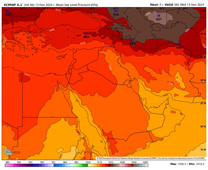 وقال المختصون في "طقس العرب"، أن هذه العملية تجبر ضغط جوي مرتفع بالتمركز بالقرب من المنطقة بشكل متكرر بفعل استمرار تقدم المرتفع الجوي نحو المنطقة، كما هو موضح بخريطة من المركز الأوروبي توضح حركة الضغوط السطحية فوق المنطقة الفترة الحالية: