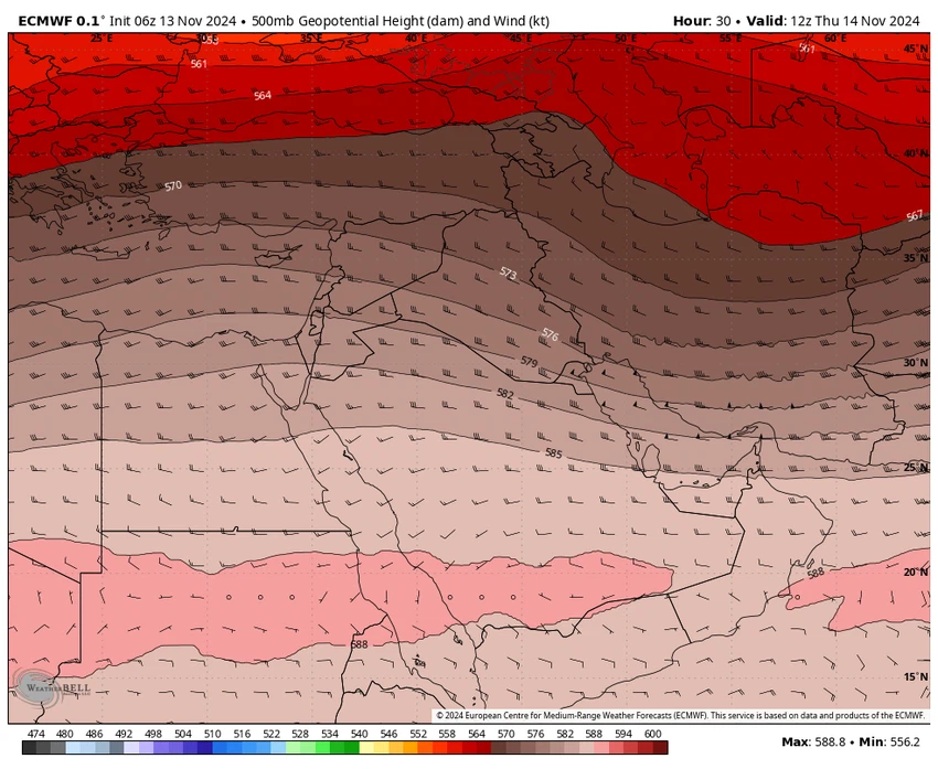 وتوضح الخريطة بالأسفل ارتفاع طبقة 500 هكتوباسكال فوق المنطقة ما يعني وجود مرتفع جوي وضغط جوي مرتفع يؤثر على المنطقة الفترة الحالية، يمنع وصول الكتل الهوائية الباردة وبالتالي أجواء مستقرة عموماً :