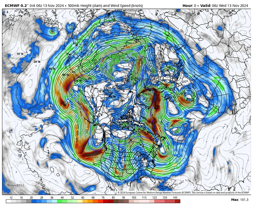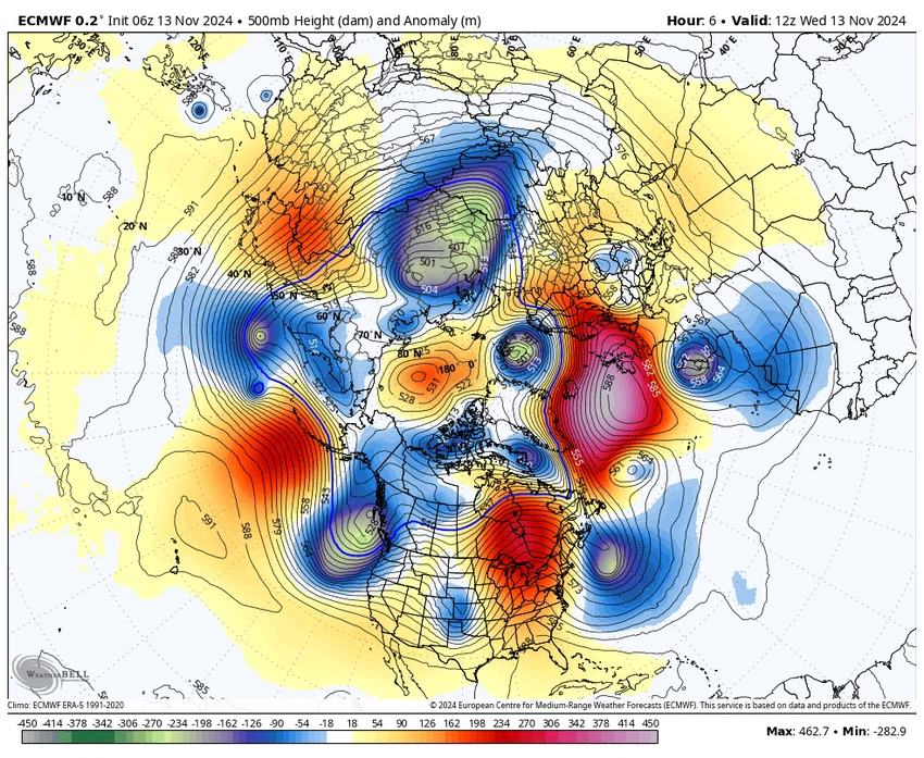 وبالعودة للسبب العلمي وراء عدم وصول الكتل الهوائية الباردة نحو شرق المتوسط بشكل كافي لتشكل المنخفضات الجوية، وبحسب الخريطة المرفقة بالأسفل لحركة الكتل الهوائية في طبقة 500 هكتوباسكال وهي الطبقة التي تنشط فيها الكتل الهوائية وتتشكل فيها المنخفضات الجوية، نلاحظ تركز اندفاع الكتل الهوائية الباردة على غرب القارة الأوروبية ودول المغرب العربي وشمال أوروبا وروسيا وشمال أمريكا وكندا، وبالتالي تجبر هذه الديناميكية الكتل الهوائية الأكثر حرارة والمرتفعات الجوية بالتحرك باتجاه منطقة الحوض الشرقي للمتوسط، وبالتالي أجواء أقل رطوبة وحرارة أعلى من المعدلات و طقس شبه مستقر يؤثر على المنطقة، وتالياً مرفق خريطة من المركز الأوروبي توضح توزيع الكتل الهوائية على طبقة 500 هكتوباسكال :
