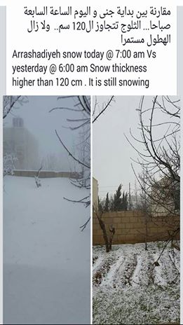 الصورة أدناه توضح الفارق في تراكُم الثلوج في منطقة الرشادية بين صباح الجمعة 20-2-2015 و صباح السبت 21-2-2015.