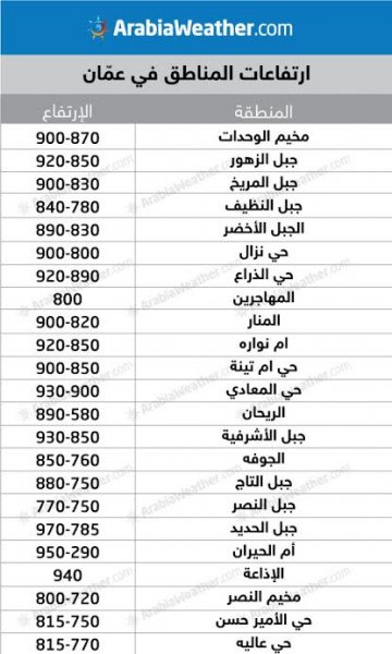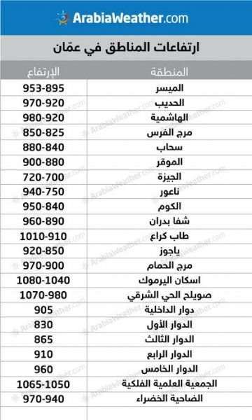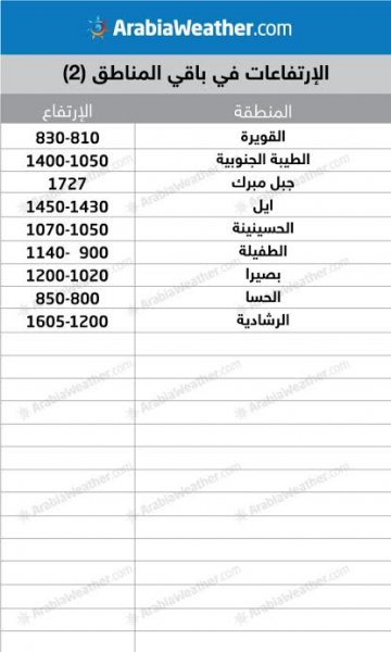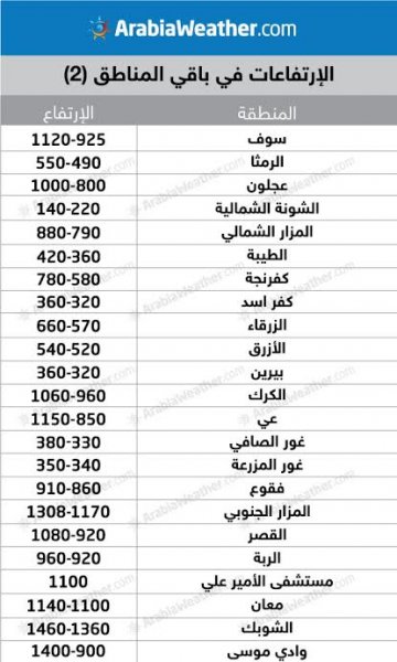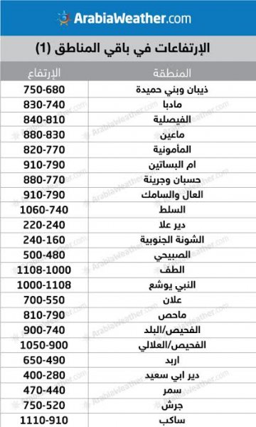 طقس العرب - سنان خلف - ما أن تقترب من المملكة من الممكلة كُتلة هوائية باردة من أصلٍ قُطبي تترافق بالثلوج على المرتفعات الجبلية العالية حتى تنهال علينا الأسئلة عن ارتفاعات المناطق لمواقع بعينها عن سطح البحر، وعن مدى شموليتها باحتمالية تساقط الثلوج، من هذا المُنطلق أطلق طقس العرب خدمة جديدة تُبين ارتفاع كافة المناطق في المملكة  من خلال خارطة بسيطة سهلة الإستخدام من خلال الضغط هنا.