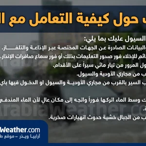 ومع إقتراب هذه الأجواء العاصفة الى ذروتها والمُتوقعة يومي الاثنين والثلاثاء ، يُطلق موقع " أرابيا ويذر " سلسلة من التحذيرات الهامة لسكان العاصمة والمناطق الشرقية ، ولعل أهم هذه التحذيرات هو خطر تشكل السيول والفيضانات كنتيجة لغزارة الأمطار وإستمراريتها .