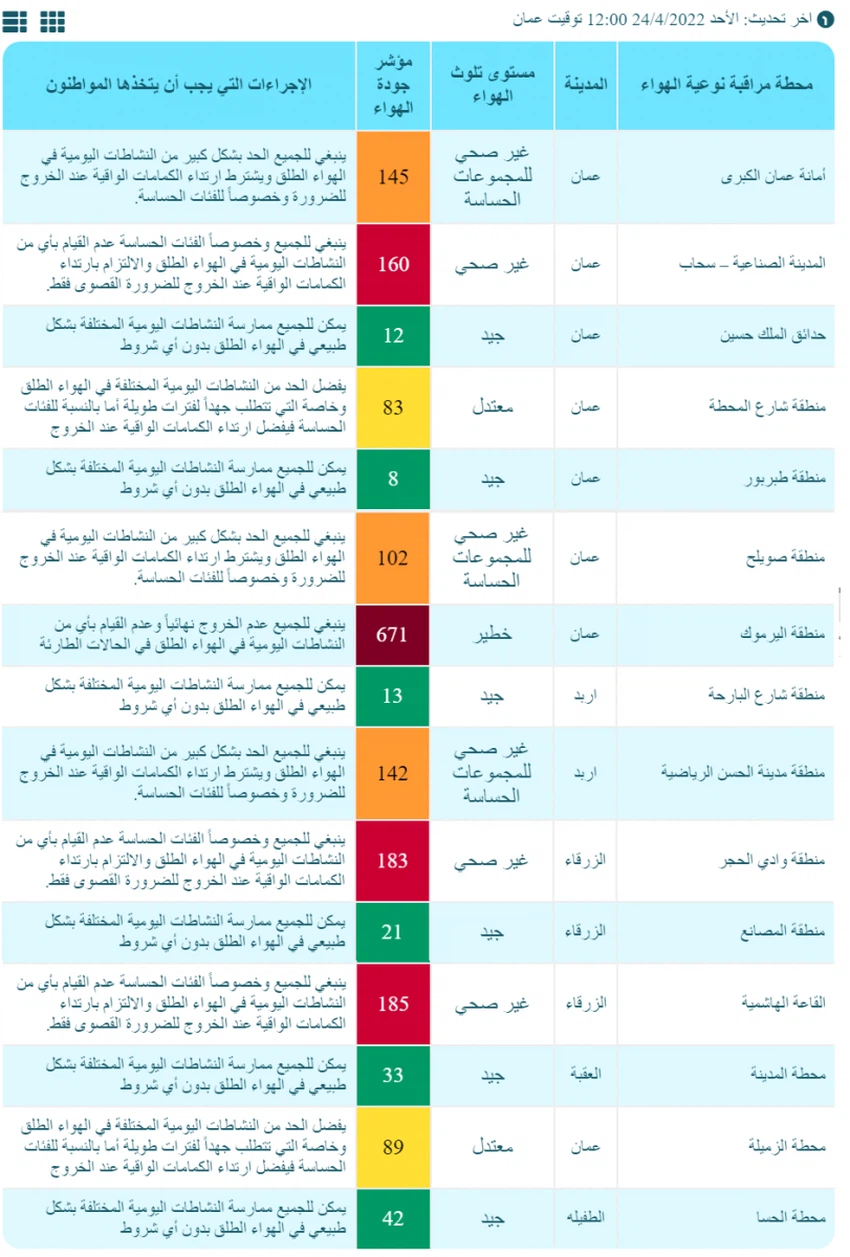 وبحسب مؤشر جودة الهواء في الأردن الذي تصدره وزارة البيئة فقد أظهر المؤشر مستويات خطيرة على الصحة العامة في بعض مناطق المملكة صباح اليوم الأحد، وغير صحي للغاية في مناطق أخرى.