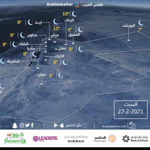 ويستمر الطقس بارداً نسبياً بوجهٍ عام و لكنه مُستقر إجمالاً، بينما يميل للدفء في مناطق الأغوار والبحرالميت و العقبة. و تظهر تدريجياً أثناء النهار بعض السحب على ارتفاعات مُختلفة. و يُحتمل هطول زخات محلية من الأمطار بمشيئة الله عصراً في بعض المناطق المُتفرقة.