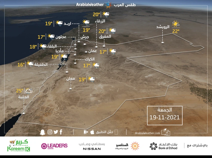طقس العرب - يتوقع أن يطرأ انخفاض على درجات الحرارة و تُصبح بذلك أقل من مُعدلاتها المُعتادة لمثل هذا الوقت من العام بقليل، بحيث يكون الطقس صباحاً رطباً مع تشكل الضباب في عِدّة مناطق، و من ثم يتحول لاحقاً ليُصبح خريفياً و مائلاً للبرودة في أغلب المناطق. و تتزايد تدريجياً كميات من السُحب على ارتفاعات مُختلفة، و تتهيأ الفرصة مع مرور الوقت لهطول زخات رعدية من الأمطار بمشيئة الله و تكون عشوائية جغرافياً (الفرصة تشمل معظم الأقاليم). و لا يُستبعد أن تكون هذه الزخات غزيرة و تترافق مع تساقط البَرَد في بعض النطاقات الجغرافية الضيقة و خاصة في مناطق الأغوار و البحرالميت و تتسبب في جريان الأودية و الشعاب و رُبما تشكل السيول المفاجئة، وتكون الرياح شمالية غربية إلى غربية مُعتدلة السرعة، تنشط بعد الظهر.