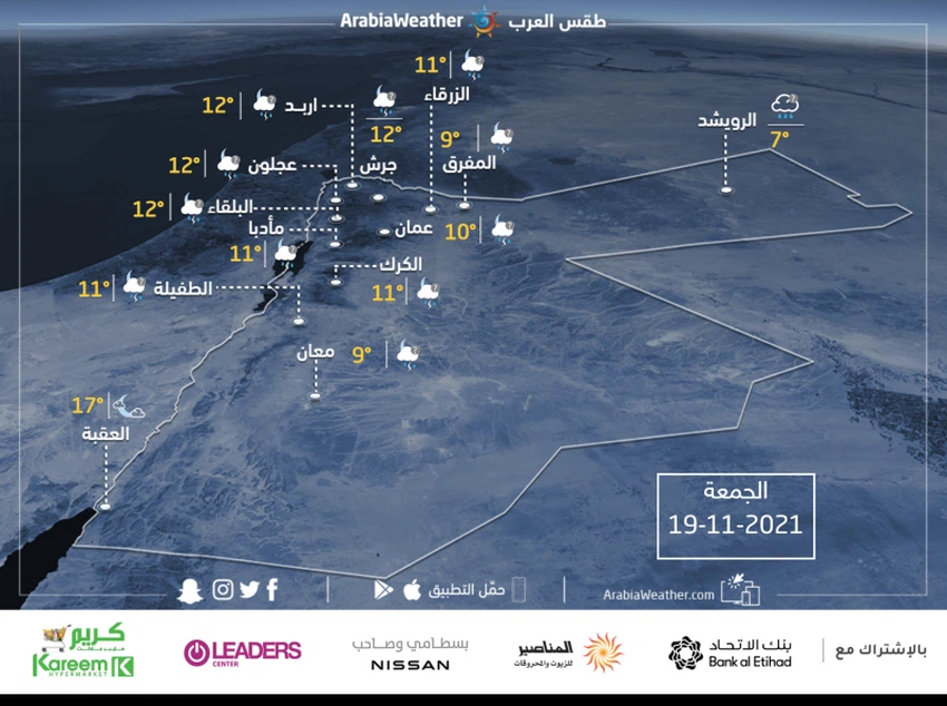 يكون الطقس بارداً نسبياً و رطباً بوجهٍ عام في أغلب المناطق، مع ظهور كميات من السحب على ارتفاعات مُختلفة. و تبقى الفرصة مُهيأة بمشيئة الله لهطول زخات رعدية من الأمطار بمشيئة الله تكون عشوائية جُغرافياً (الفرصة تشمل معظم الأقاليم). و لا يُستبعد أن تكون هذه الزخات غزيرة و تترافق مع تساقط البَرَد في بعض النطاقات الجغرافية الضيقة و خاصة في مناطق الأغوار و البحرالميت و تتسبب في جريان الأودية و الشعاب و رُبما تشكل السيول المفاجئة