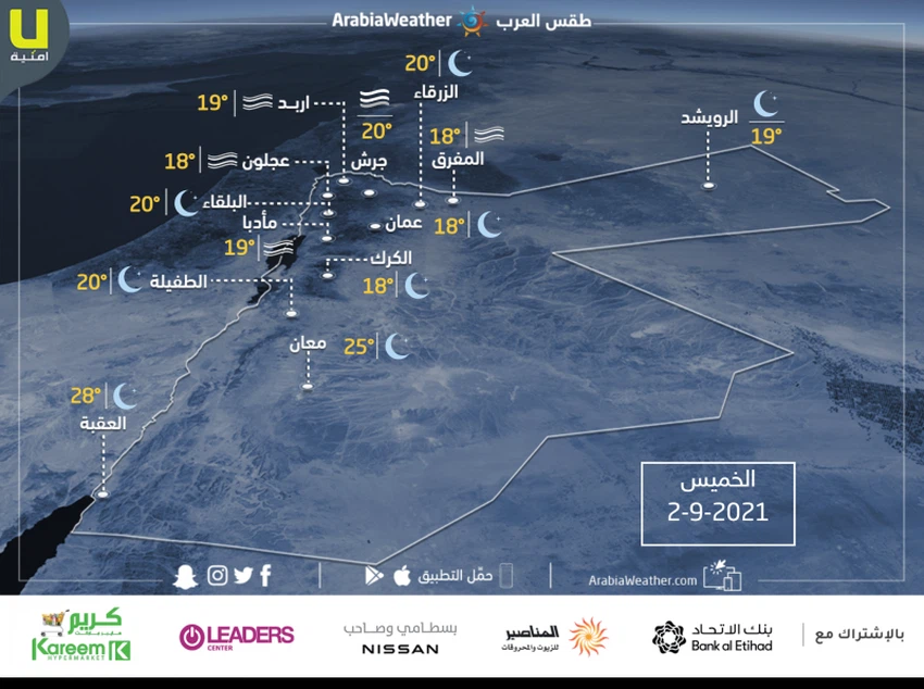 طقس العرب - من المتوقع ان تنخفض درجات الحرارة لتصبح حول إلى أعلى بقليل من معدلاتها لمثل هذا الوقت من العام ويكون الطقس حاراً نسبياً في الجبال بينما يستمر حاراً في الاغوار والبحر الميت والعقبة والبادية، وفي حين الرياح تكون شمالية غربية معتدلة السرعة في عموم المناطق، تؤدي إلى إثارة الغبار خاصة في المناطق الصحراوية.