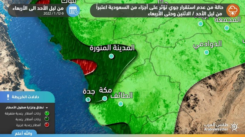 طقس العرب – سنان خلف - لا تزال كافة المُعطيات الجوية ومُخرجات أنظمة المُحاكاة الحاسوبية في طقس العرب تُبشر بتأثر مدينة جدة بعد مشيئة الله بأحوال جوية غير مستقرة، تبلغ ذروتها مع ساعات صباح يوم الاثنين بمشيئة الله تعالى.