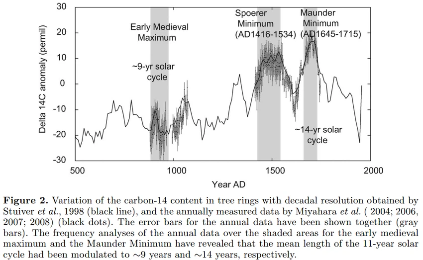 تمت دراسة نسب الكربون من خلال تحليل حلقات الأشجار لـ 1200 عام ماضية وقد وُجدت علاقة بين درجات الحرارة من جهة وبين النشاط الشمسي والمجال المغناطيسي لها والأشعة الكونية وتركزت الدراسة على فترة العصور الوسطى، حيث سادت درجات حرارة أكثر دفئاً من الوقت الحاضر، حيث كانت جرينلاند (القطب الشمالي) على سبيل المثال خالية من الجليد في بعض الفترات وازدهرت الحضارات وعلى النقيض تماماً في فترة العصر الجليدي المصغر الذي تلى العصور الوسطى؛ انتشرت الأمراض والمجاعات في قارة أوروبا حيث تصادفت هذه الفترة مع نشاط منخفض جداً للشمس والمجال المغناطيسي لها خاصة بين عامي 1650-1715.