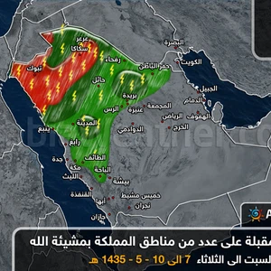موقع ArabiaWeather.com- عمر الدجاني- تُشير التوقعات إلى تأثُر أجزاء واسعة من شمال السعودية و بعض المناطق الغربية والوسطى بحالة جويّة ماطرة اعتباراً من مساء السبت و يوم الأحد تُصنف بأنها قويّة الفعالية، لذا فإنه يُستحسن أن يتم التحضير لها و التحذير منها حتى تمر الحالة الجويّة على خير وسلام بإذن الله.