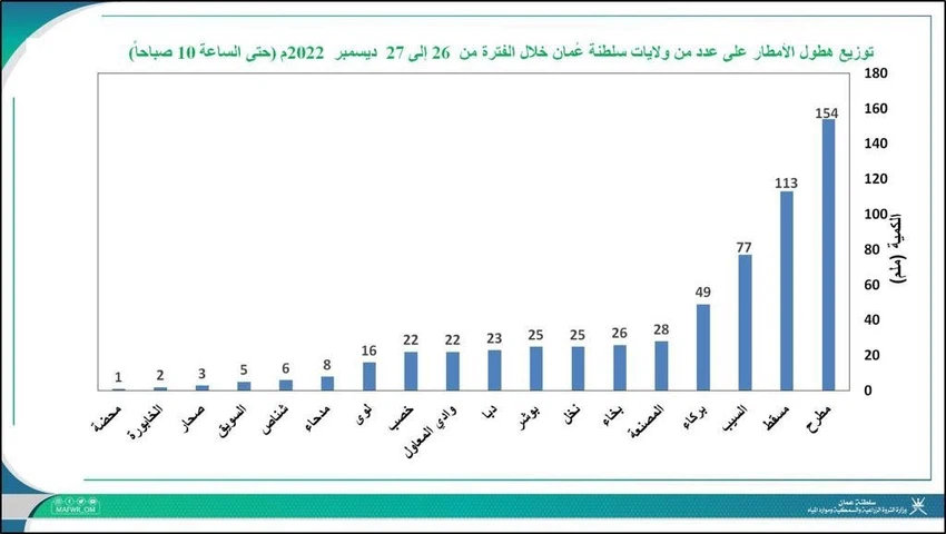طقس العرب - سنان خلف - أصدرت وزارة الثروة الزراعية والسمكية في سلطنة عُمان تقريراً يتضمن توزيع هطول الامطار وكمياتها على عدد من ولايات سلطنة عُمان في الفترة من 26 إلى 27 ديسمبر 2022 (حتى الساعة 10 صباحاً)
