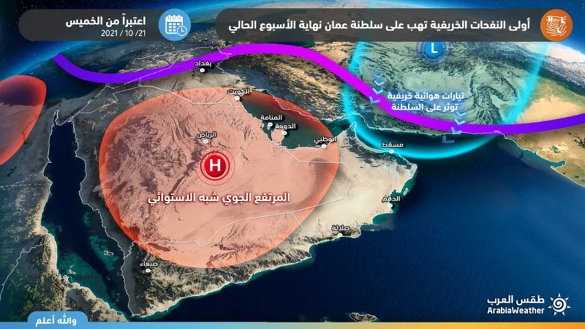 طقس العرب - يُراقب عن كثب قسم إدارة العمليات والتنبؤات الجوية في طقس العرب مُخرجات الخرائط الجوية والتي باتت تشير إلى أن هناك كتلة هوائية خريفية مندفعة على شمال سلطنة عُمان اعتباراً من يوم الخميس تنخفض على إثرها درجات الحرارة بشكلٍ ملموس كما تتهيأ معها الفُرصة لهطول بعض الأمطار في مناطق محدودة من السلطنة، وتالياً التفاصيل: