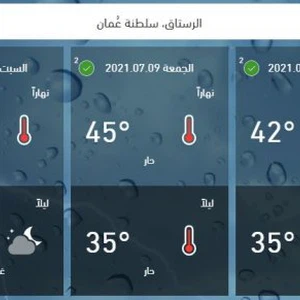 اما عن درجات الحرارة، فيُتوقع أن ترتفع درجات الحرارة يوم الخميس، إذ تُصبح درجات الحرارة حول منتصف الأربعينيات في مُعظم الولايات الداخلية، بينما تكون الأجواء أكثر اعتدالاً في المناطق الساحلية ودرجات حرارة في نهاية العشرينيات في المناطق الساحلية المُطلة على بحر العرب، كما تكون الرياح متقلبة الاتجاه ومعتدلة السرعة، تنشط احياناً وتكون مثيرة للأتربة والغبار في بعض المناطق الصحراوية.