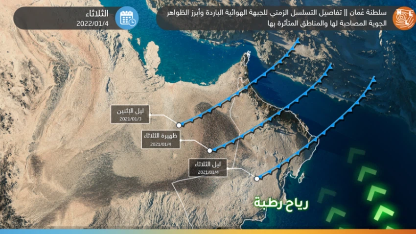 وفي التفاصيل، تعبُر جبهة هوائية تدريجياً أجواء السلطنة خلال الساعات القادمة بحيث تهطل الأمطار على أجزاء من المناطق الساحلية المُطلة على بحر عُمان والحجر الغربي والمناطق المجاورة به، وخلال ساعات نهار يوم غد الثلاثاء يتعمق تأثير الجبهة الهوائية الباردة لتشمل الأمطار عموم المناطق الشمالية من السلطنة، بحيث تشمل الأمطار محافظات البريمي وشمال وجنوب الباطنة والداخلية والظاهرة ومسقط وشمال وجنوب الشرقية بمشيئة الله.