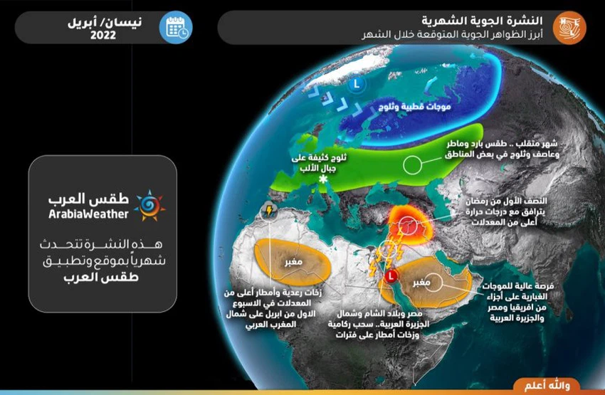 طقس العرب - صدّر عن مركز طقس العرب الإقليمي للأرصاد والتنبؤات الجوية توقعاته الجوية لشهر أبريل/نيسان 2022 والذي يُصادف شهر رمضان المُبارك، لعموم مناطق شبه الجزيرة العربية بما في ذلك سلطنة عُمان، وعنّون مركز طقس العرب النشرة الشهرية لشبه الجزيرة العربية : بأجواء حارّة مُبكرة بالتزامن مع بداية شهر رمضان المبارك والأمطار واردة في بعض الفترات إن شاء الله.