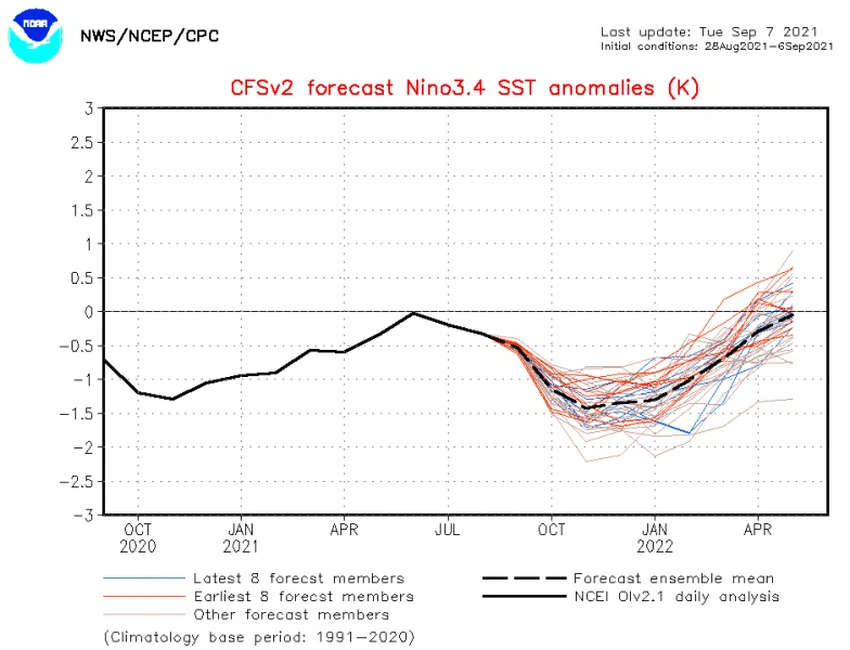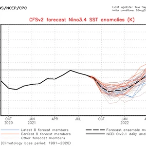 وتُعرف ظاهرة اللانينا على أنها انخفاض بدرجات حرارة (تبريد) سطح المياه في المنطقة الاستوائية من المحيط الهادي عن معدلاتها العامة بأكثر من 0.5 درجة مئوية، وبحسب الخريطة التالي المرفقة من الإدارة الوطنية للمحيطات والغلاف الجوي (NOAA)، تشير إلى تطور ظاهرة اللانينا خلال الأشهر القادمة بمشيئة الله.