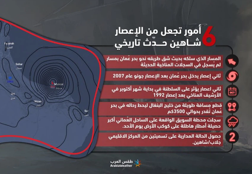طقس العرب - تُعتبر سلطنة عمان من أكثر الدول العربية تعرضاً للأعاصير والعواصف المدارية، وتتلقى سلطنة عمان، التي تقع في الركن الجنوبي الشرقي من شبه الجزيرة العربية، بانتظام آثار الأعاصير المدارية بسبب ساحلها الممتد على بحر العرب، كما تتأثر السلطنة بالحالات المدارية مع بداية شهر مايو وهي بداية موسم الأعاصير في بحر العرب والتي تنتهي في شهر ديسمبر، وتأثرت السلطنة بداية الأسبوع الحالي باعصار شاهين الذي ترافق مع عِدّة ظروف جوية استثنائية.