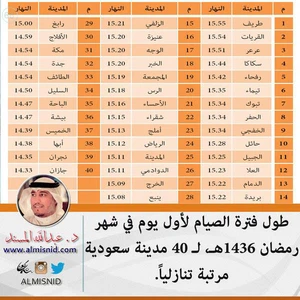 ونشر المسند عبر صفحته على "تويتر" رسم توضيحي، يكشف عن طول ساعات الصيام في تلك المناطق، حيث ستكون ساعات الصيام في محافظة طريف هي الأطول بين مدن المملكة بواقع 15 ساعة و55 دقيقة لأول أيام رمضان.