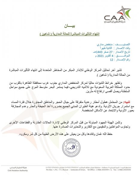 طقس العرب - أصدرت الأرصاد العمانية قبل قليل بياناً هاماً تُعلن فيه انتهاء التأثيرات المباشرة للحالة المدارية شاهين على السلطنة، وفيما يلي نص التحذير:
