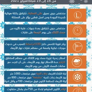 - أمطار غزيرة وعواصف رعدية وبرَدَية مُتوقعة في شمال المملكة، تكون على شكل زخات ثلجية فوق مُرتفعات 800 متر وتكون مُتراكمة، تمتد بشكل متقطع نحو اجزاء من مرتفعات الوسط والجنوب.