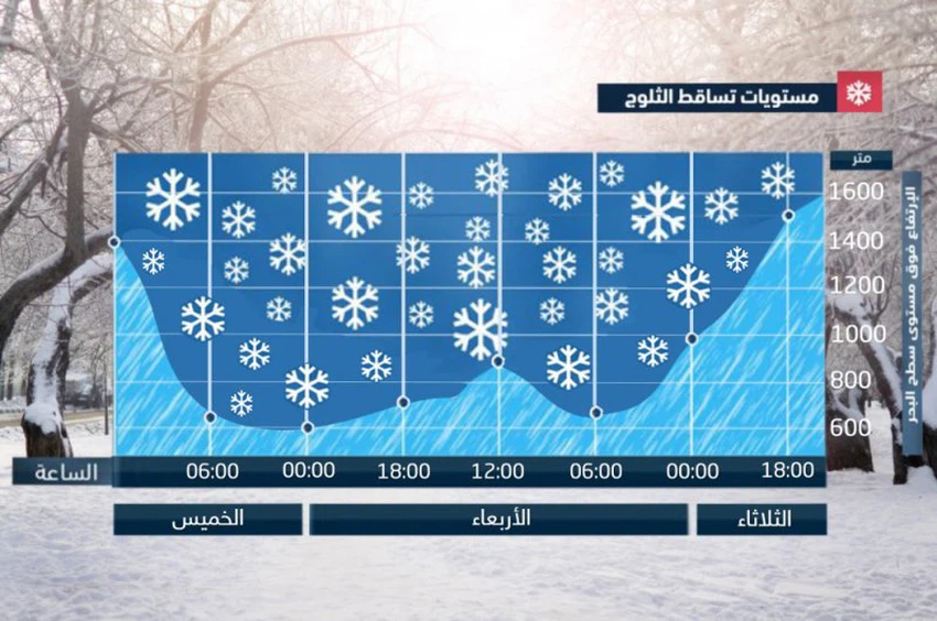 وإليكم رسم توضيحي يظهر ارتفاع تساقط الثلوج ويلاحظ انخفاض مستويات تساقط الثلوج خلال ساعات صباح يوم الأربعاء ولكن مع عدم وجود هطولات كافية، والفرصة الأفضل مع ساعات مساء وليلة الأربعاء/الخميس حيث يصل مستوى تساقط الثلوج إلى أقل من 800 متر، في حين يرتفع بشكل لافت مع انحسار المنخفض الجوي تدريجياً مع ساعات الصباح المُتأخر من يوم الخميس.