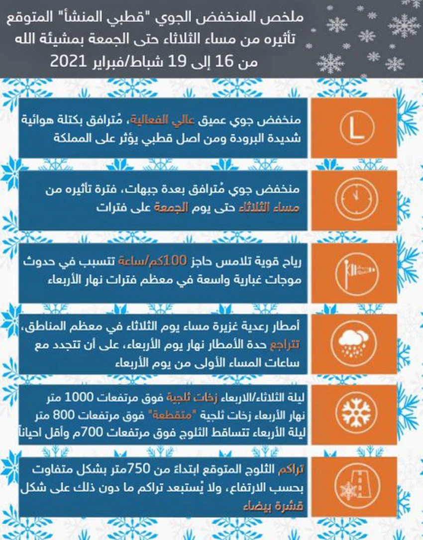 تُشير آخر البيانات المستلمة من نماذج التنبؤات الجوية الحاسوبية وصور الأقمار الاصطناعية الى تأثر المملكة بمُنخفض جوي عميق يُصنف بأنه عالي الفعالية، سيتشكل نتيجة اندفاع كتلة هوائية قطبية قارسة البرودة مُباشرة من غرب روسيا إلى المنطقة تبدأ بالتأثير اعتباراً من مساء الثلاثاء، وعلى إثر ذلك فيُتوقع أن تشهد المملكة الأحوال و الظواهر الجوية التالية: