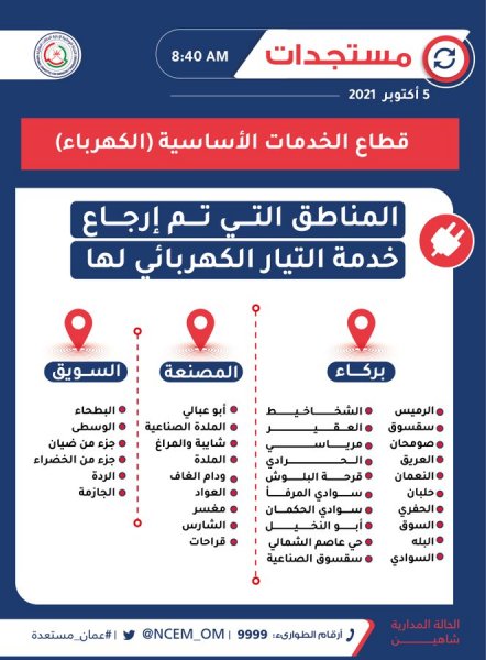طقس العرب - بعد انقطاع التيار الكهربائي عن بعض المناطق التي تضررت من تأثيرات الحالة المدارية شاهين، تم إرجاع خدمة التيار الكهربائي في بعض المناطق وهي: بركاء والمصنعة والسويق.