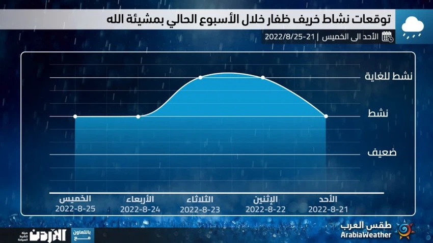 طقس العرب - قال المُتنبئون الجويون في مركز "طقس العرب" أن التوقعات تُشير إلى تحسن نشاط خريف ظفار خلال الأيام المُقبلة بمشيئة الله، وذلك بالتزامن مع اقتراب انتهاء العطلة الصيفية وعودة الطلاب إلى المدارس.