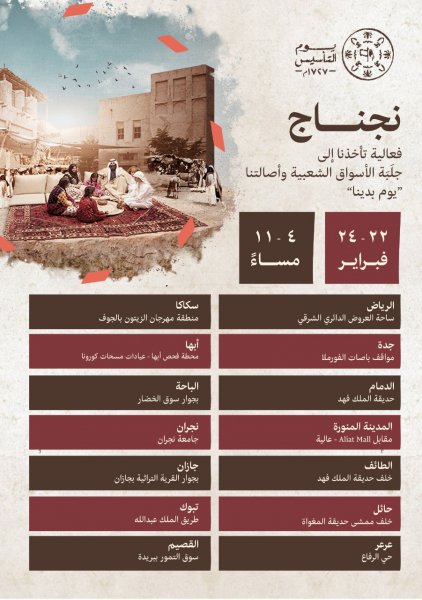 يضم هذا الاحتفال الثقافي حول المملكة استعراضاً للملبوسات والأزياء التقليدية السعودية، إلى جانب معرض فني وندوات ثقافية تاريخية وآخر مختص بالقهوة السعودية، وعروض الألعاب النارية مع مجموعة من البرامج المناسبة لأذواق الجميع!