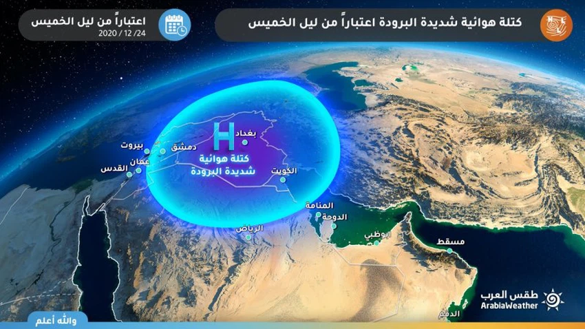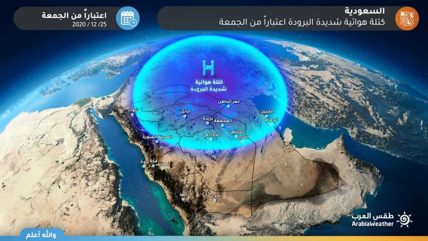 يستمر المرتفع الجوي السيبيري بالامتداد جنوباً وغرباً وتمتد معه الكتلة الهوائية الباردة، حيث تنخفض درجات الحرارة في شمال السعودية نهار الجمعة ثم تليها الأردن و لبنان وفلسطين ليل الجمعة/السبت، حيث تصبح الأجواء شديدة البرودة ليلاً مع نشاط كبير في سرعة الرياح الشرقية والجنوبية الشرقية التي ستزيد من الشعور بالبرودة.
